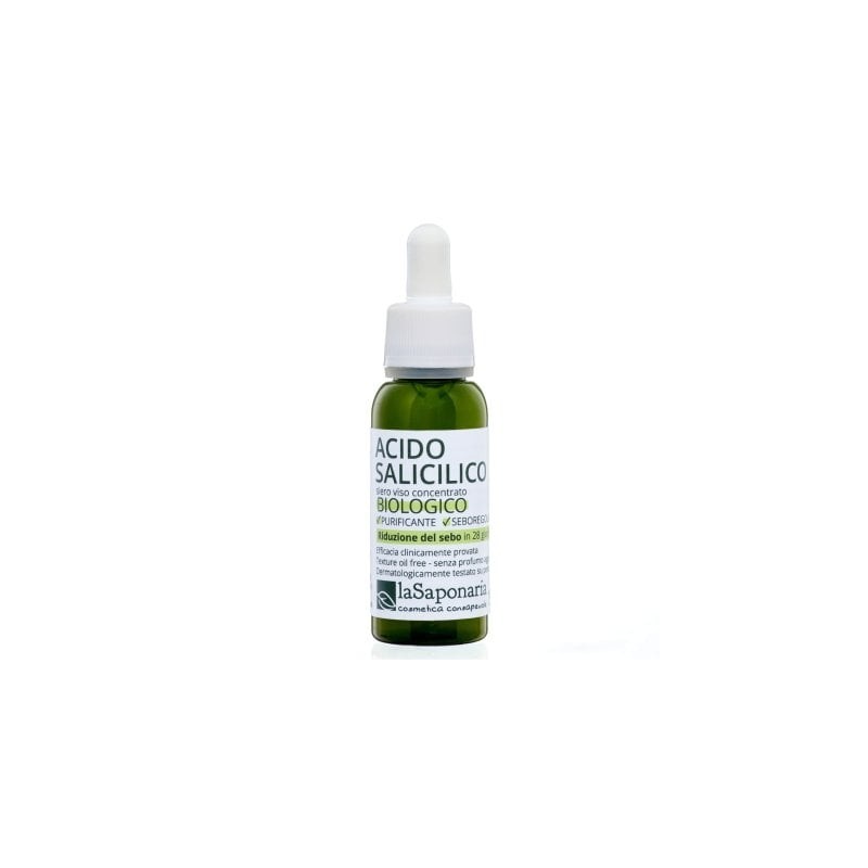 Siero viso concentrato certificato biologico formulato da Acido Salicilico, una molecola dotata di proprietà esfolianti che si rivela particolarmente utile in caso di acne o pelle impura.